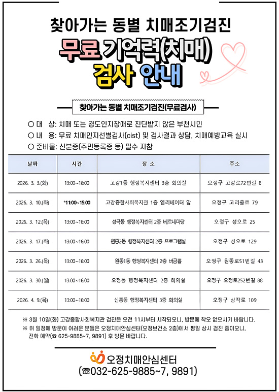 보건소 소식공지사항건강프로그램민원서식자료실공지사항2026년 설 연휴 문 여는 병의원, 약국 지정 및 운영 안내2026-02-10예비 및 신혼부부 임신 전 무료 건강검진 마감 안내2025-07-15부천시 말라리아 진단·진료 의료기관 안내2025-07-082025년 임신 사전건강관리지원사업 조기 마감 안내2025-03-062026년 소사보건소 치매관리사업 대체근로 기간제근로자 채용 최종합격자 공고2026-02-27공지사항 더보기건강프로그램2026년 부천시 장애인 재활수영 생활체육교실 참여자 모집2026-02-252026년 소사보건소 걷기챌린지 「함께 걸어 행복한 소사, 다함께 워크ON!」 참여자 모집 안내2026-02-232026년 부천시장애인회관 기관 재활운동 프로그램 참여자 모집2026-02-112026년 부천시 보건소 걷기 챌린지 건강도시 만들기「부천IN! 워크ON!」참여자 모집2026-01-262026년도 「튼튼쑥쑥 건강키움교실」운영 안내 및 참여 모집2026-01-21건강프로그램 더보기민원서식자료실예비 및 신혼부부 임신 전 무료 건강검진 사실혼 확인보증서 서식2026-01-12심폐소생술 교구대여 신청 및 결과보고서2025-11-17감염병 발생신고 서식 등2025-10-01예방접종 예진표(25.3.7.~)2025-09-10영구 불임 예상 난자·정자 냉동 지원사업 신청서 등2025-05-08민원서식자료실 더보기